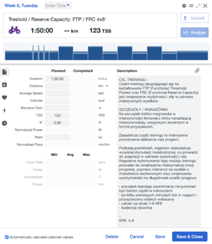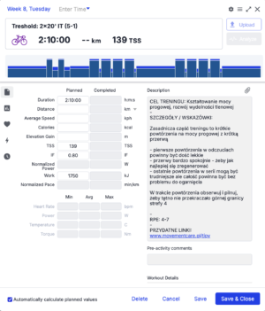 - praktycznie każdy trening jest rozpisany w formie ‚structured workout’ – czyli gotowe do eksportu na Zwift, Garmin, Wahoo, Rouvy, Mywhoosh i inne urządzenia / aplikacje treningowe