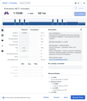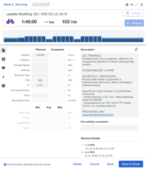 - w drugiej części planu istotny focus na poprawę tolerancji laktatu, rozwój FTP i wytrzymałości siłowej