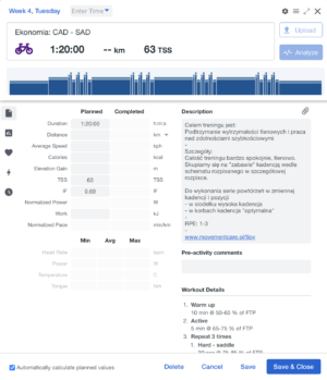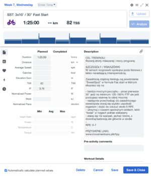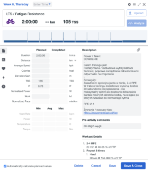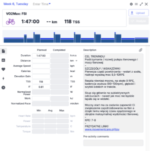 - praktycznie każdy trening jest rozpisany w formie ‚structured workout’ – czyli gotowe do eksportu na Zwift, Garmin, Wahoo, Rouvy, Mywhoosh i inne urządzenia / aplikacje treningowe